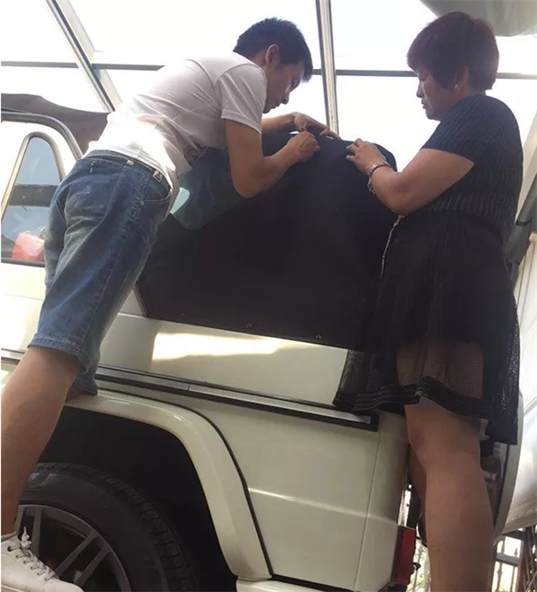 这事得从青岛韩先生说起,韩先生今年43岁,爱车是奔驰G350 BlueTEC敞篷版,白车身、黑敞篷。据韩先生说,这辆车买来前前后后加上改装花了300多万。有一次韩先生倒车的时候,不小心把车敞篷划破了。韩先生询问了4S店,换一个车蓬估计要4、50万,情急之下,他就在青岛找人暂时用针线补了一下。
