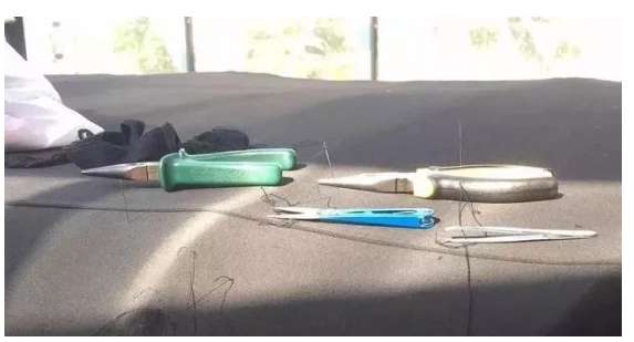 第二难在手法:敞篷的材料,一般都是非常硬的布料,行针要用力道,而且因为不能自如翻转,不像衣服布料能捧在手上上下穿针,补敞篷要左右手同时开工。